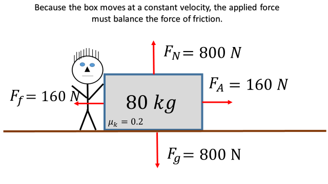 Mrs Stickman is pushing a 80 kg box. The coefficient of kinetic friction between the box and the ground is 0.2. How much force does Mrs Stickman need to use to keep the box moving at a constant velocity?
