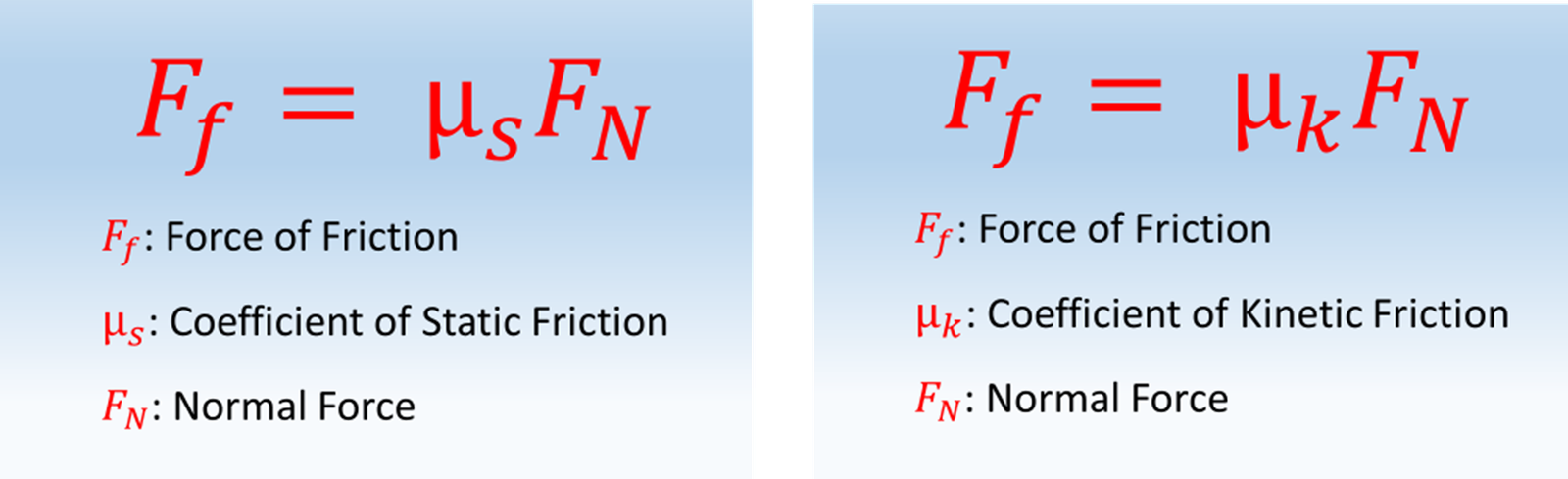 The second way of finding the strength of a friction force is by equation. The equation is a little different depending on whether the object is moving or not moving. Here are the two equations:
