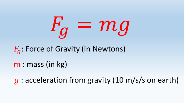 With this equation, finding the gravitational force on an object is simple. Just multiply an object's mass by 10 and you will find the force of gravity.