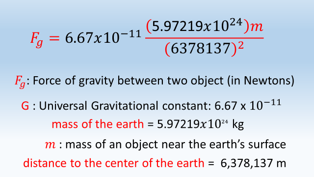 There is a simpler equation we can use whenever we need to know the force of gravity on an object near a planet's surface. Take the equation above, put in the earth's radius (6378137 meters) for 'r' and the earth's mass (5.97219 x 1024kg) for one of the m's.