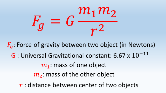Gravity is a force that attracts things with mass to other things with mass. The direction of gravitational force is toward the center of the mass causing the force. Gravitational force only exists if there are two objects with mass. Both objects will experience the same force. Object 1 will be pulled toward object 2, and object 2 will be pulled toward object 1. These 2 gravitational forces are equal and opposite. They are force pairs. The strength of the gravitational force between two objects can be calculated with this equation:
