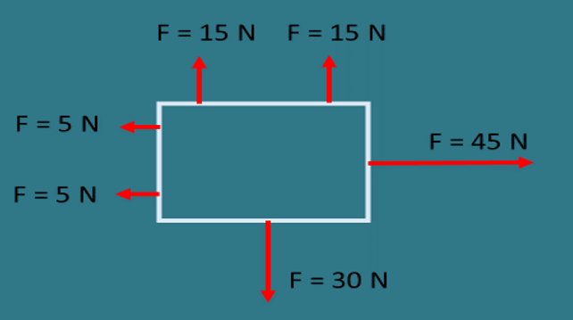 Now, lets look at the horizontal forces. The force to the right is 45 N. The forces to the left = 5 + 5 = 10 N.
