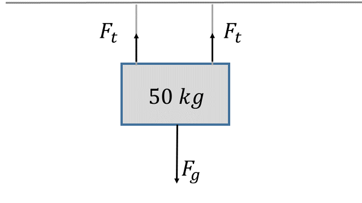 On the example on the right, the same 50 kg box is now hanging from two ropes. The force of gravity is still 500 N. However, there are two tension forces that balance the force of gravity. As long as these ropes are at the same angle and same distance from the center of the box, they will split the force equally. Each rope provides a tension force of 250 N.
