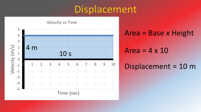 Velocity graphs can be used to find distance and displacement. Displacement is equal to the area between the graph line and the graph’s horizontal axis.