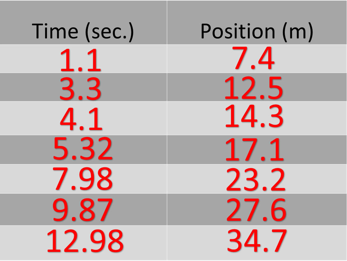 In Physics, we study motion. There are ways to organize information about an object’s motion so that it is easier to see what is going on. Two of the most common ways are tables and graphs. A table looks like this: