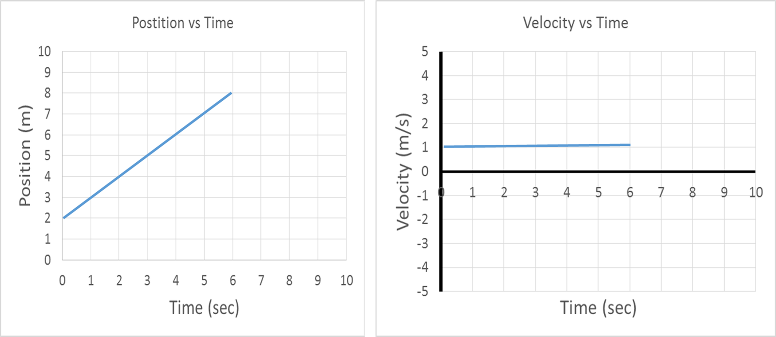 In the above example, the slope of the position vs. time graph is 1. Because the slope doesn’t change, we know that the velocity has not changed. The velocity has remained 1 m/s for the entire time. The velocity vs. time graph will always be a flat line when velocity is constant.