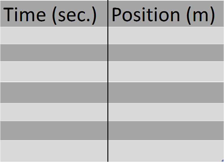 A table keeps track of two or more pieces of information. The first column keeps track of time. The second column keeps track of what position the object was in at that time. Watch the video and see how the table is filled out.