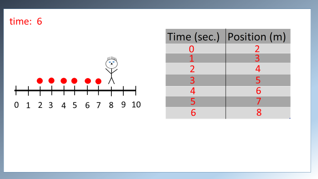On the right, we have filled out a data table. The data table has time on the left and position on the right. By looking at this table, we can find out some information about Mr. Stickman’s motion. We can find out where it started. We can find out what direction he was going. We can find out his velocity. And, we can find out his displacement.