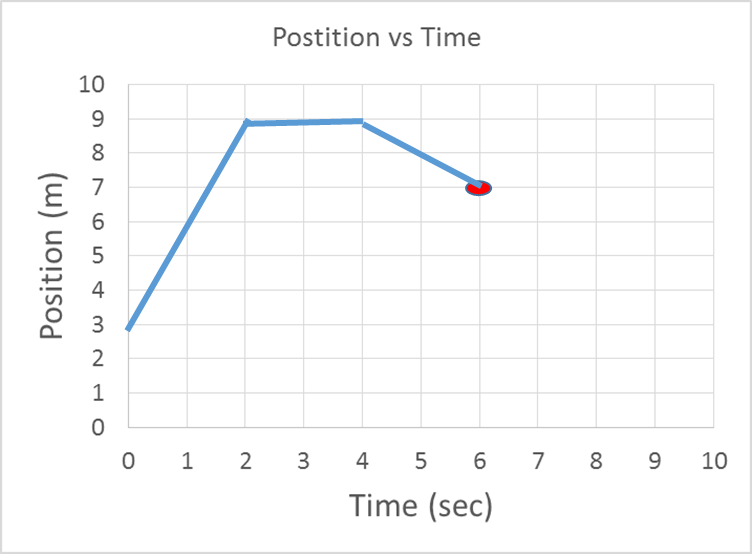 Each line segment of the graph has a different slope. This means there are three different velocities. For the first two seconds, the velocity is 3 m/s. For the next 2 seconds the velocity is 0 m/s. For the last two seconds, the velocity is -1 m/s. In each case, the velocity is found by dividing how much the line went up by how much the line went across.