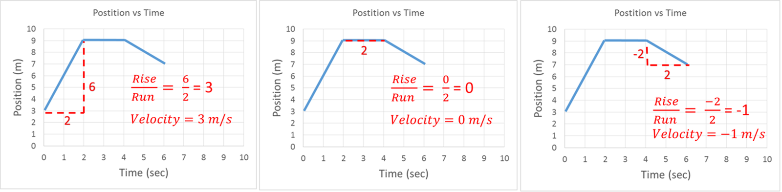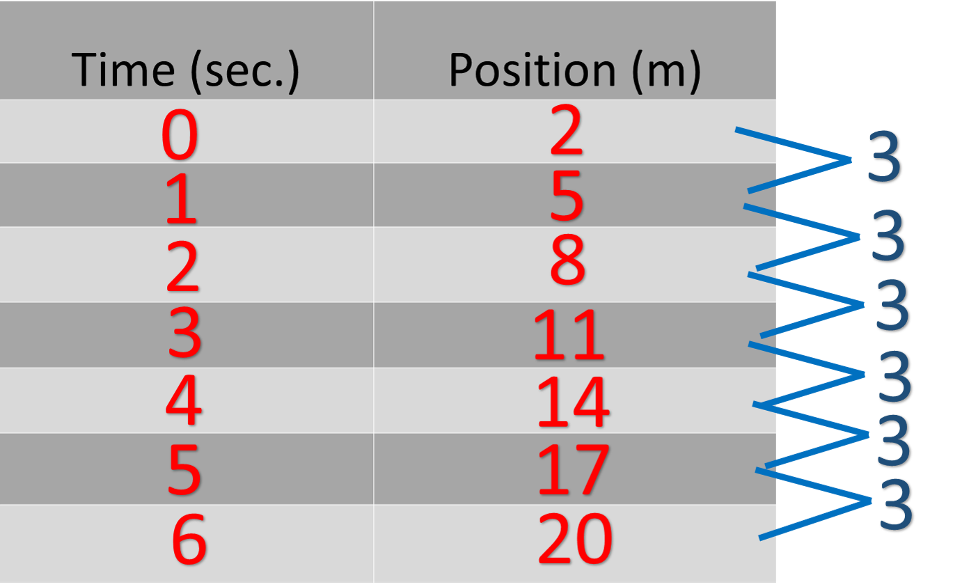 In this data table, you can see that the position increases by 3 meters every second. This tells us the velocity is 3 m/s. Since there is not always this nice of data, we need other ways to find velocity.