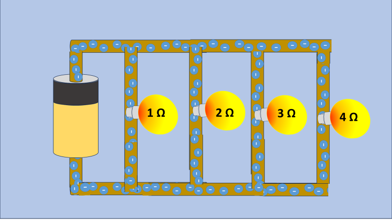 A series circuit is a circuit in which there is only one path for the electric current to flow. In every series circuit there will be a source of voltage (for example: a battery), a conducting material (for example: copper wires), and one or more resistors. A resistor is any component that slows down the current. To keep things simple; we will use lightbulbs for the resistors, wires for conductors, and batteries for a voltage source.
