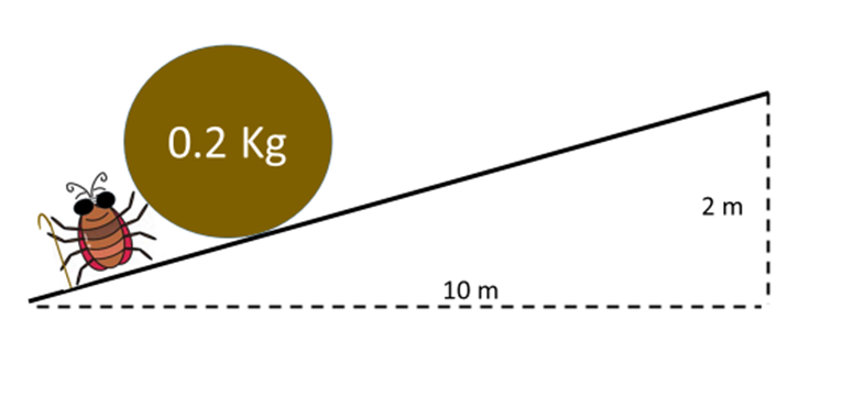 Kaw-Kaw Roach pushes his 0.2 kg ball up the top of a 2 meter high ramp. It takes 80 seconds to reach the top of the ramp.