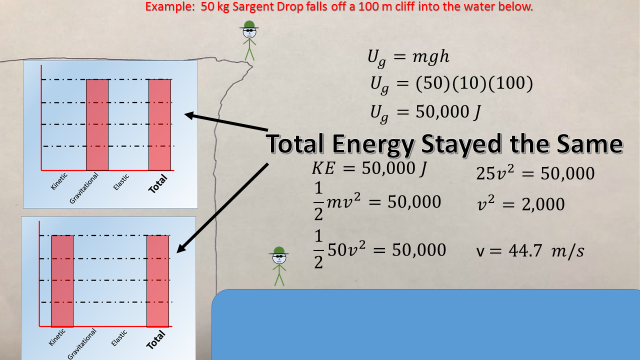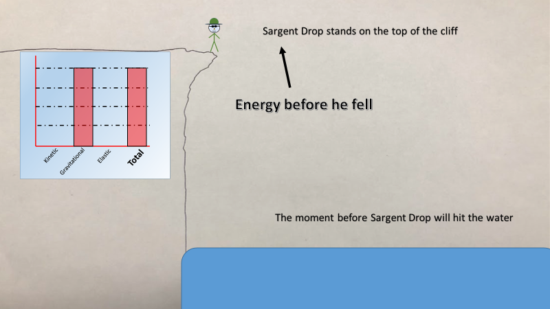 Look at this example to see what happens to Sargent Drop's energy when he jumps off a cliff: